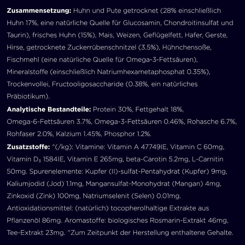 - Inhaltsstoffe: Fettsäure DHA, zur Förderung der Lernfähigkeit von Welpen, Kalzium für die Knochen- und Gelenkentwicklung. Maßgeschneiderte Ballaststoffmischung aus dem Präbiotikum FOS, MOS. Plus Rübenschnitzel für eine gesunden Verdauung. Frisches, schmackhaftes Huhn, leicht verdaulich mit hochwertigen tierischen Proteine zum Aufbau und Erhalt einer kräftigen und schlanken Muskulatur. Natürliche Omega-6 und Omega-3-Quellen für eine gesunde Haut und glänzendes Fell.