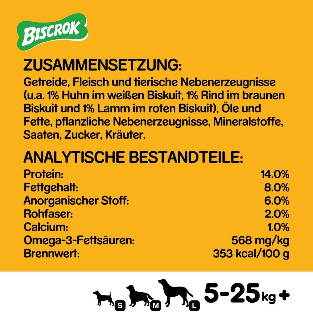 Die Pedigree / Mars* Biscrock Hundekekse haben 3 verschiedenen Geschmacksrichtungen. Zusammen in einer Packung sind 3 Sorten Hundekekse mit Rind (brauner Biskuit), Lamm (roter Biskuit) und Huhn (weißer Biskuit). Als Liefermenge sind verschiedene Losgrößen verfügbar. Z.B. 6 x 500g Biscrock, 12 x 500g Markies oder 5 x 1,5 kg Markies Vorratspackung.