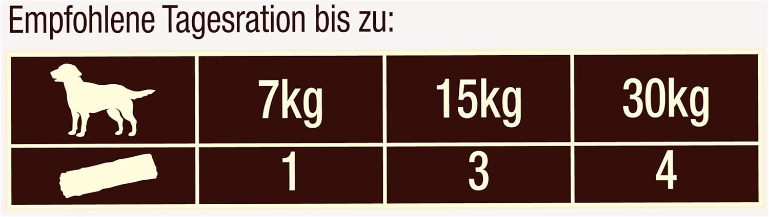 - Tagesration: 1 Stück (Hunde bis 7kg), 3 Stück (7 – 15kg ), 4 Stück (15 -30kg) + frisches Wasser